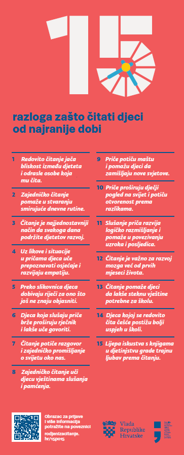 Pozivamo roditelje da zajedno s djecom svaki dan odvoje barem 15 minuta za čitanje naglas – kod kuće, prije spavanja ili u zajedničkom obiteljskom trenutku.
